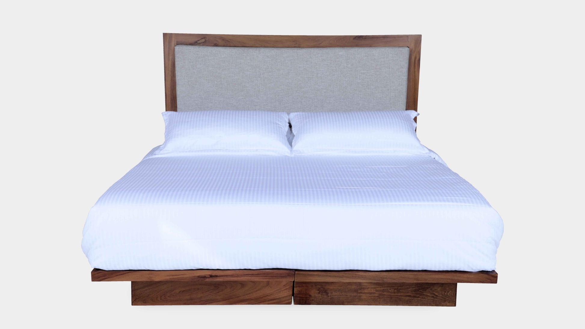 Cama con diseño lineal, terminado en madera de parota y tela en el color de tu elección. Los colores pueden varias en la madera ya que es un producto natural, se entrega desmontada. La recamara tamaño King la basa se entrega en dos piezas para hacer más funcional su transporte. Incluye cabecera y base. Pieza se entrega desmontada los colores pueden variar. No incluye decoración.