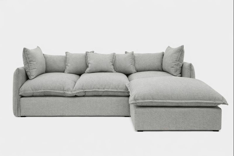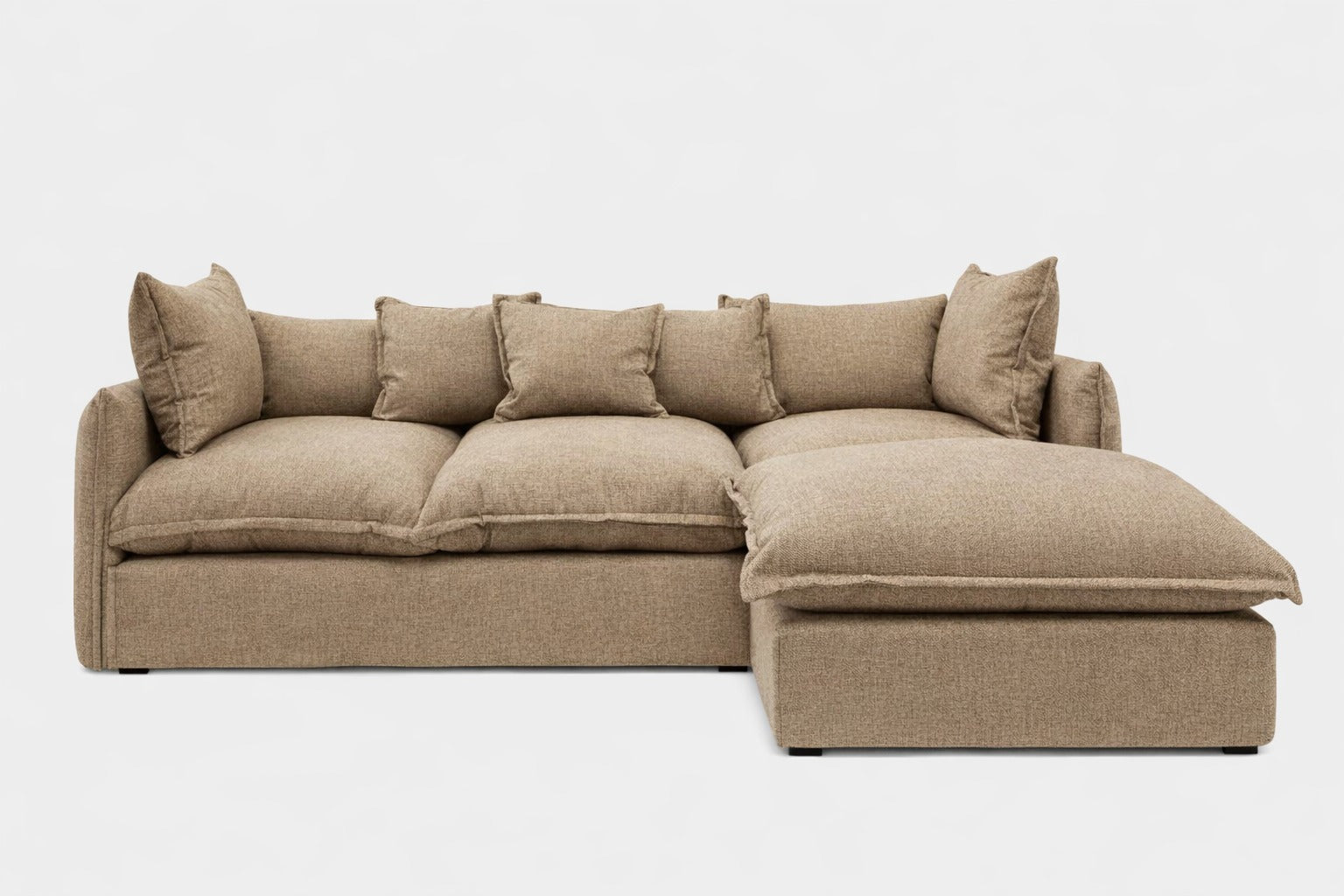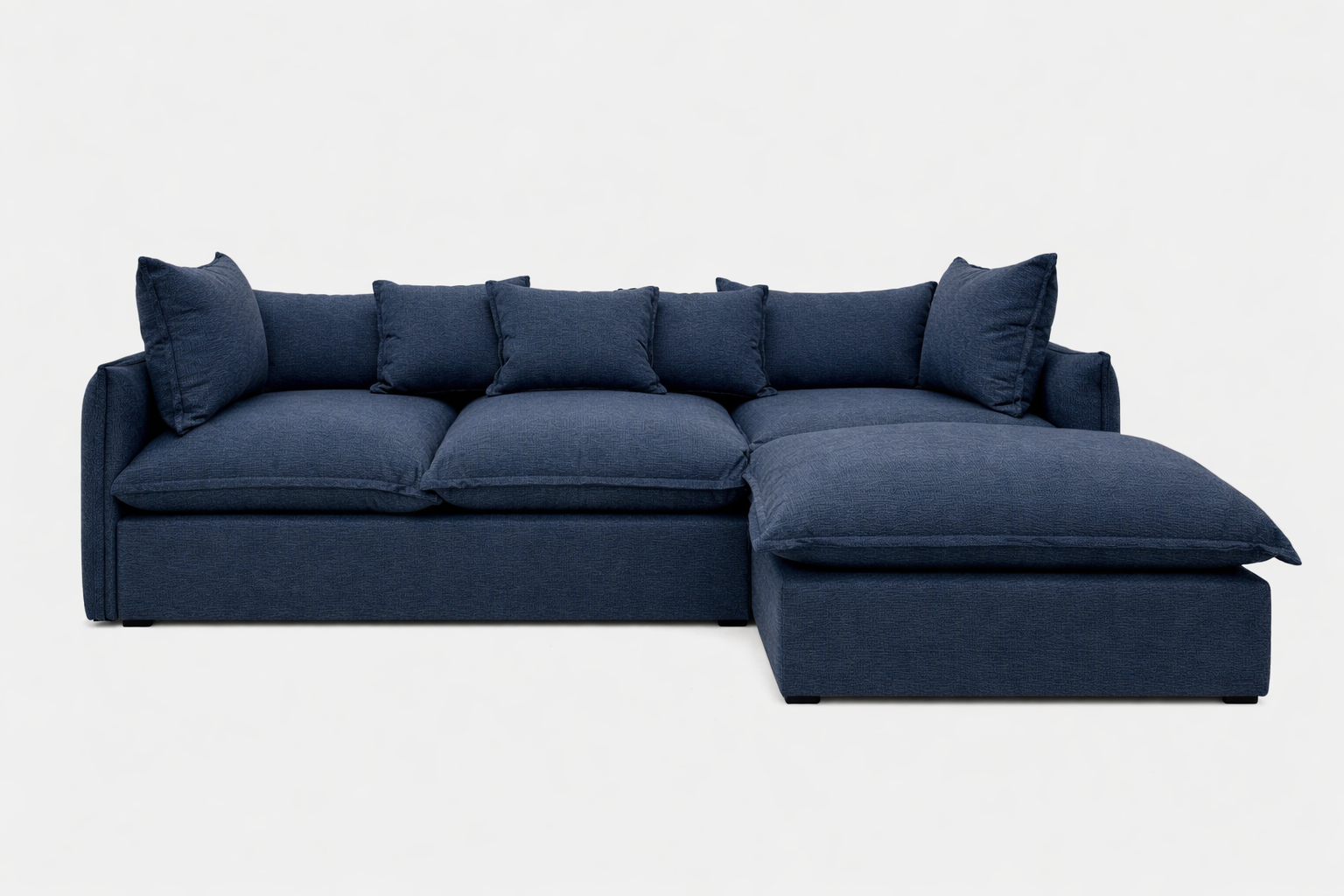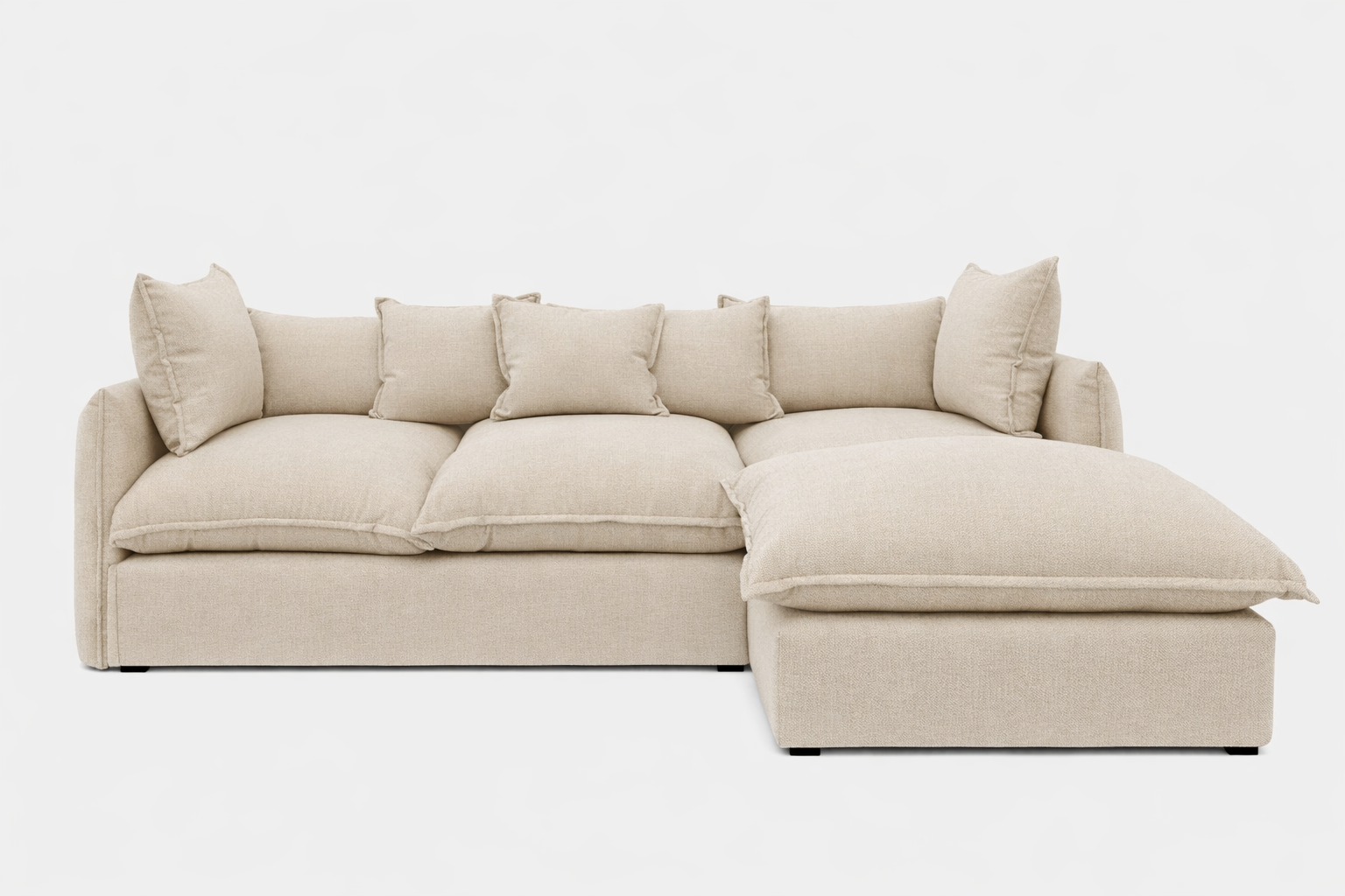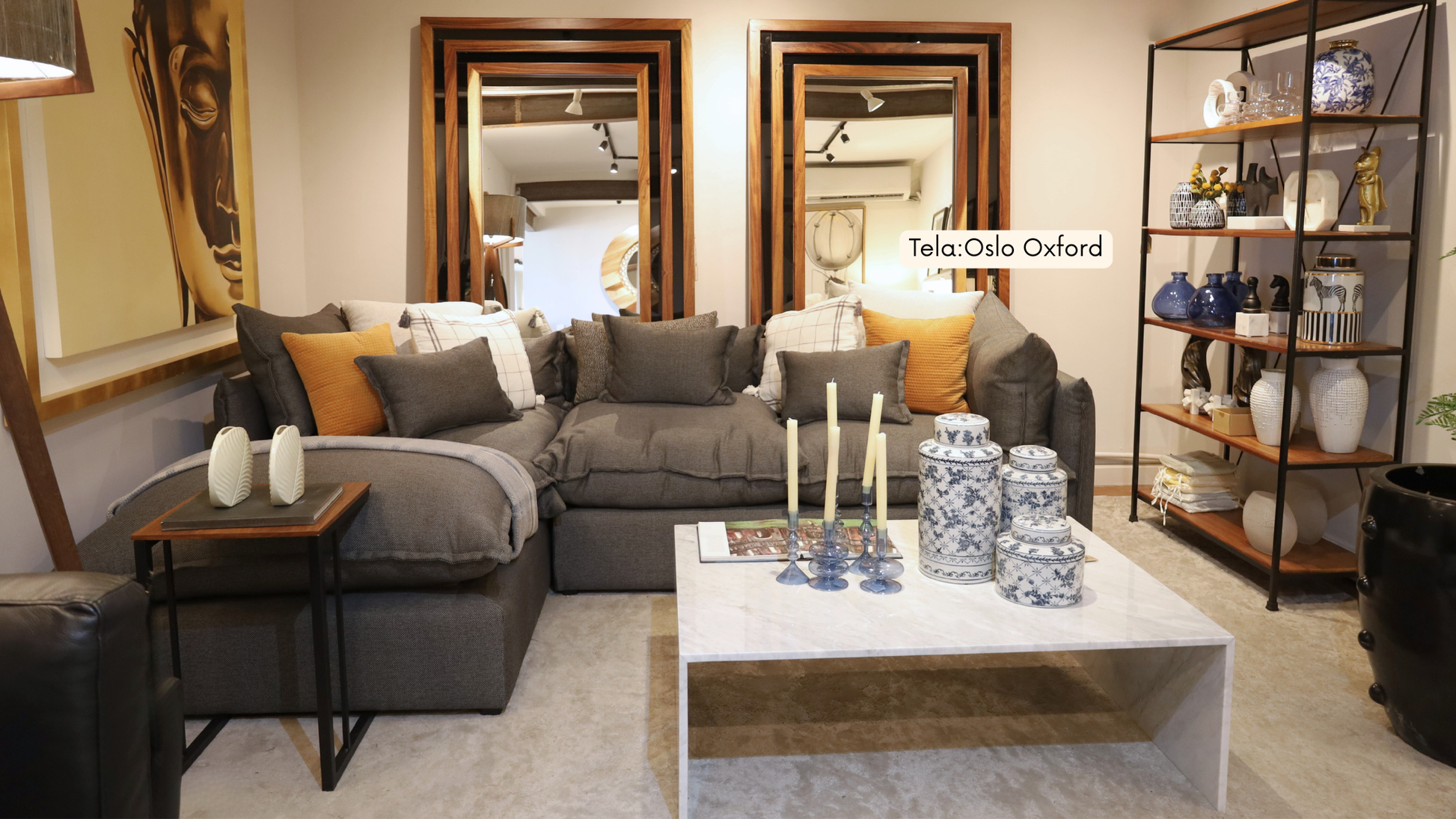 Sala con estructura de madera estufada, relleno de espuma de poliuretano, rellenos de cojines en fibra de poliuretano y tapizada en la tela de tu elección a base de poliéster.